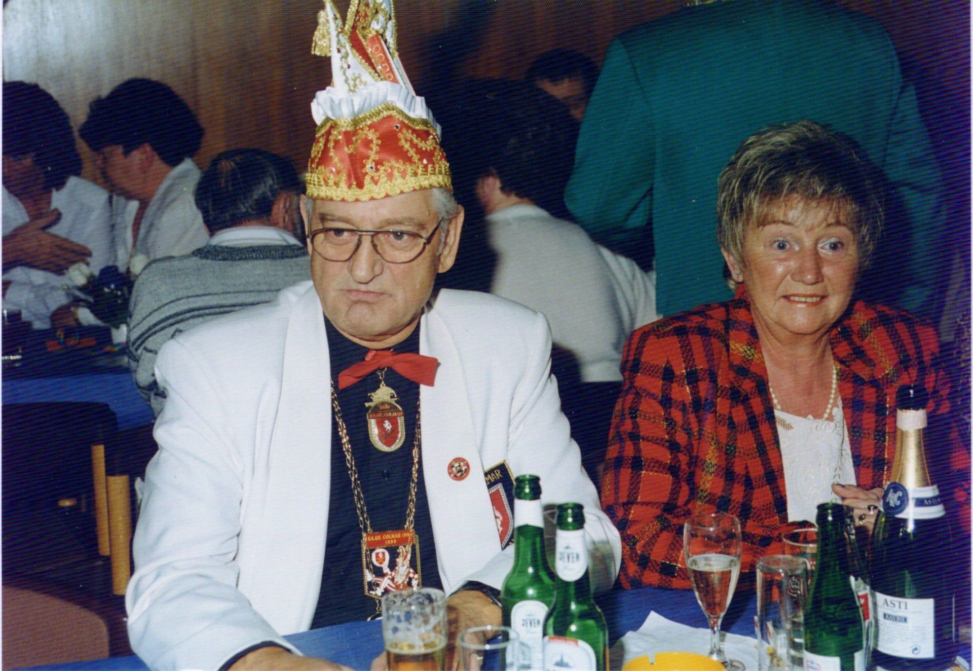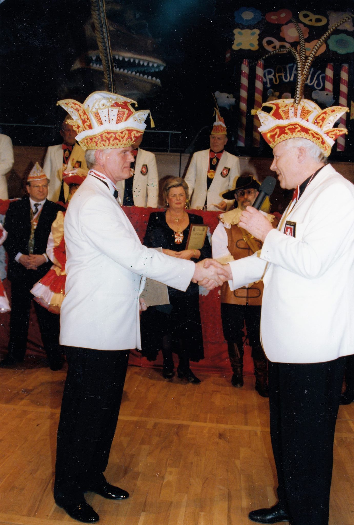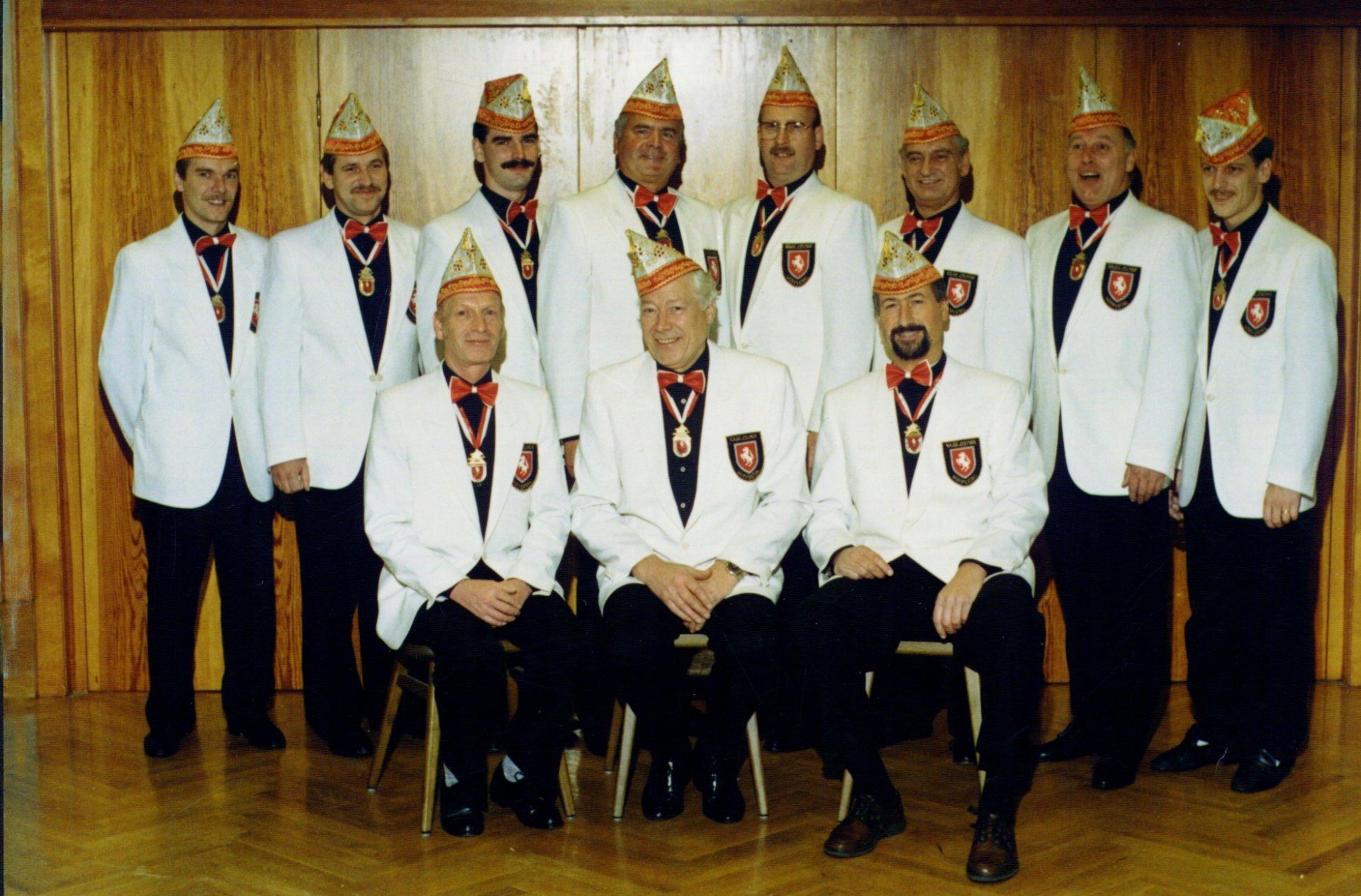 Mit fast ausverkauftem Haus wurde der Fleiß der Gesellschaft belohnt. Großen Anklang fand auch die 6. Festzeitschrift. An diesem Abend wurde der Gesellschaft, die von den Ehrensenatoren gesponserte Standarte übergeben. Frau Ellen Winkelmann- Morschel, Herr Dr. Werner Hausberger und Herr Karl-Heinz Krahl wurden zu neuen Ehrensenatoren ernannt. Sitzungspräsident Herr Horst Beermann wurde das 1. Ehrenmitglied der Gesellschaft. Bis weit nach Mitternacht jagte ein Programm Höhepunkt den nächsten. Nach Sitzungsende wurde dann, damals noch im Rossini, bis in die frühen Morgenstunden weiter gefeiert.