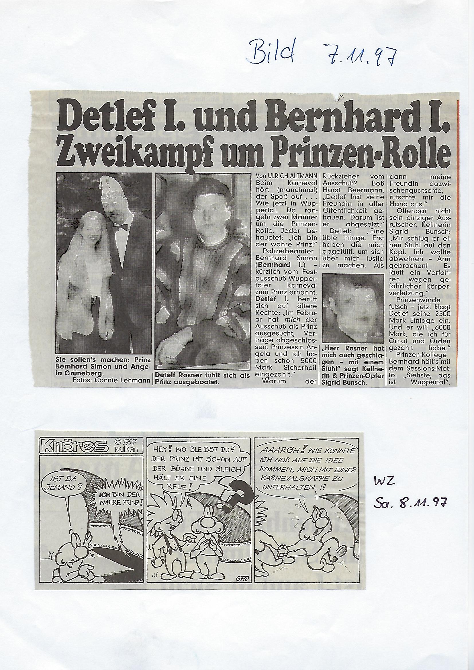 In der 7. Festzeitschrift konnten alle nachlesen was sie im Vorjahr gesehen oder verpasst hatten. Bis 0.00 Uhr jagte ein Programm Höhepunkt den anderen. Frau Rosi Urbinger, Herr Gerd Kaldewey, Herr Hermann-Josef Richter sowie Herr Karl Heinz Pisula wurden zu neuen Ehrensenatoren ernannt. Es war ein wahrer Augen,- und Ohrenschmaus und ein Lachmuskeltraining vom Allerfeinsten. Um 0.00 Uhr hatte Präsident Bernd Waldbrecher dann Geburtstag und seine Gesellschaft schenkte ihm, eine eigens für ihn angefertigte Präsidentenkette. Nachdem im Vorjahr das Rossini sich als zu klein erwies, fand der Abend dann seinen Ausklang bei Musik und Tanz im Offenbach-Saal. An diesem Abend kam eine Spendensumme von 6000,- DM für krebskranke Kinder zusammen.