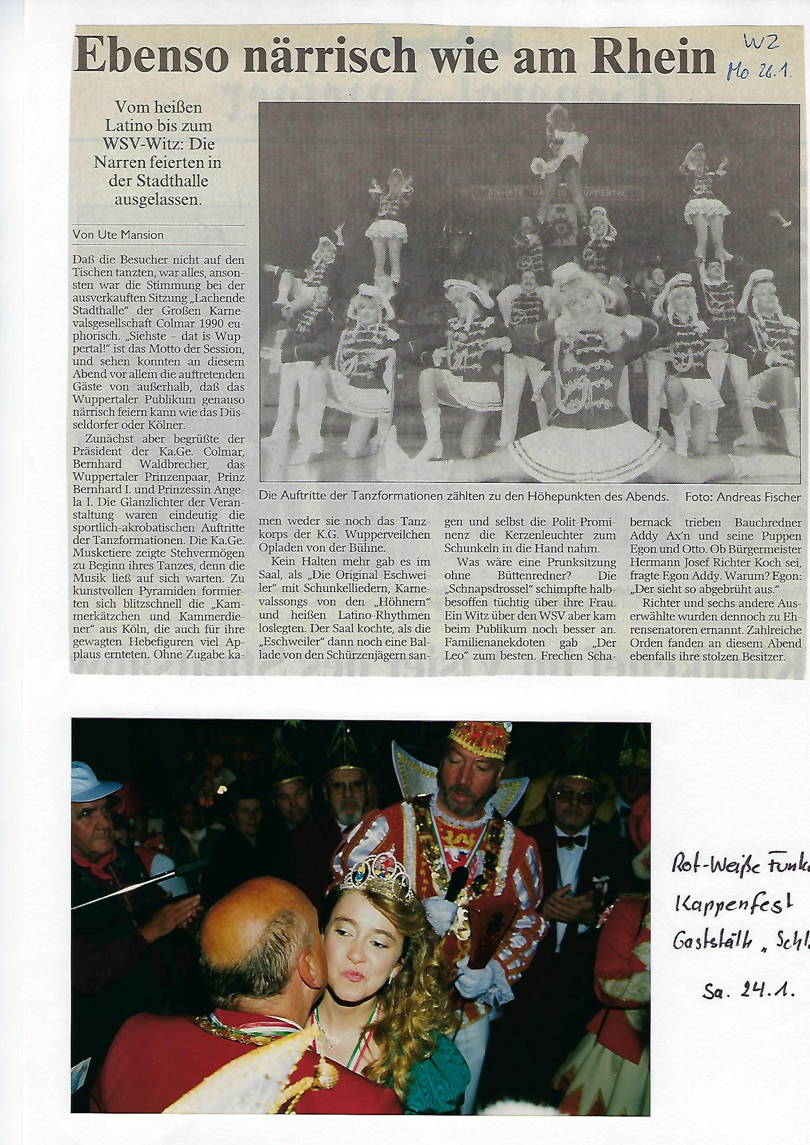 So fand dann im Februar 1989 die erste Karnevalistische Veranstaltung, in der Truppenküche der Colmar Kaserne statt. Unterstützt wurden Bernd und Gunni bei Ihrem Vorhaben vom Uffz.-Corps des RakArt-Btl.72. Mit ca. 200 Personen und einem tollen Karnevalistischen Programm, in Anwesenheit des Wuppertaler Stadtprinzenpaares, ging diese Veranstaltung bis tief in die Nacht. Da Bernd nicht ganz so firm in den Abläufen des organisierten Karnevals war, holte er sich für die Moderation Hilfe von seinem Freund Horst Beermann, der zu diesem Zeitpunkt Präsident der Ka. Ge. Musketiere von 1971 e.V. war. Es war ein voller Erfolg!